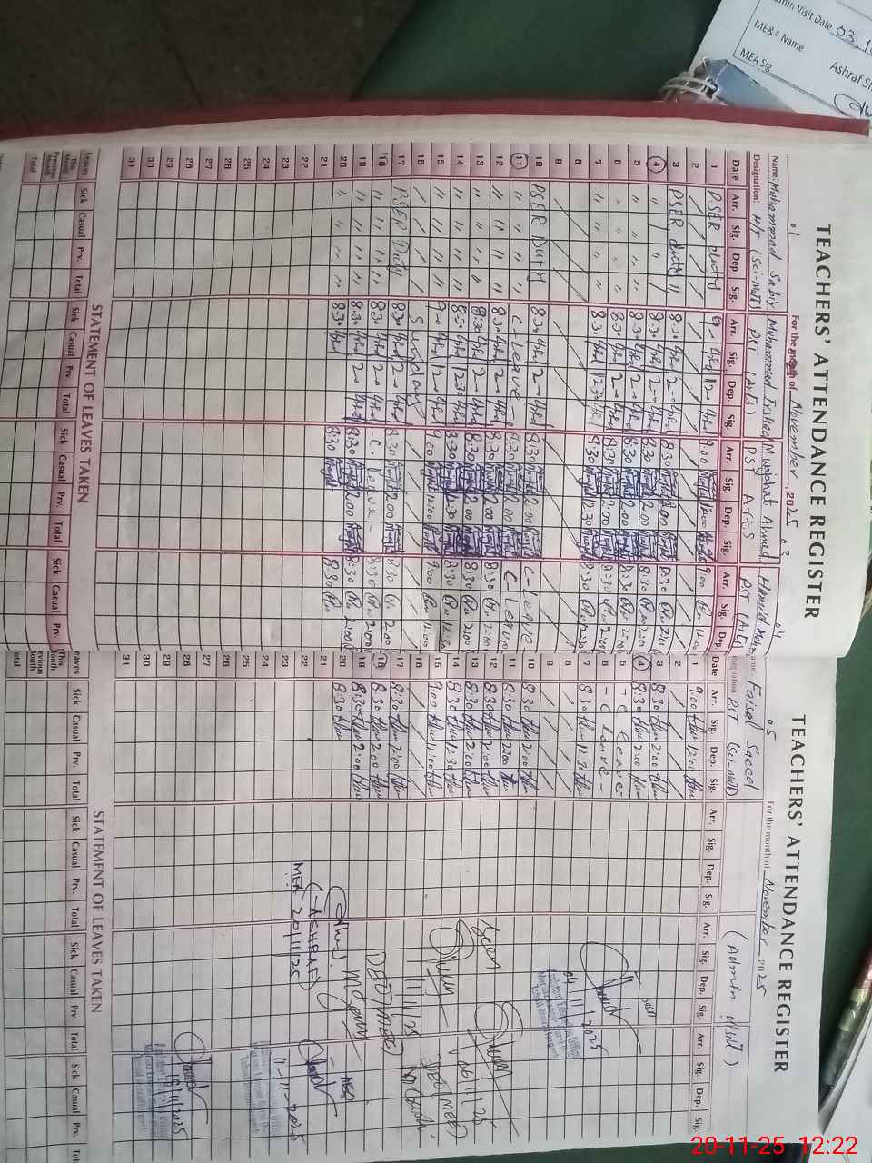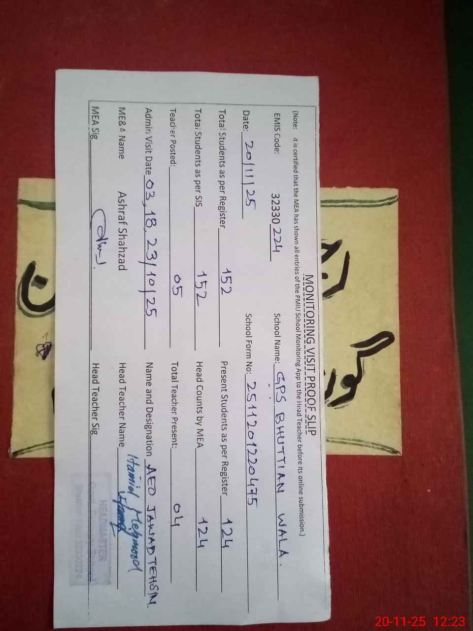 | Attendance Register | Head Teacher | MEA with School | Visit Proof |
