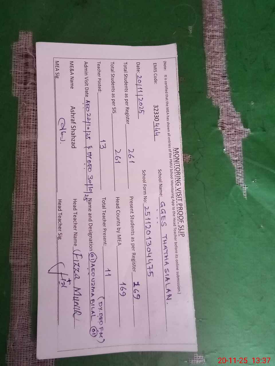 | Attendance Register | Head Teacher | MEA with School | Visit Proof |