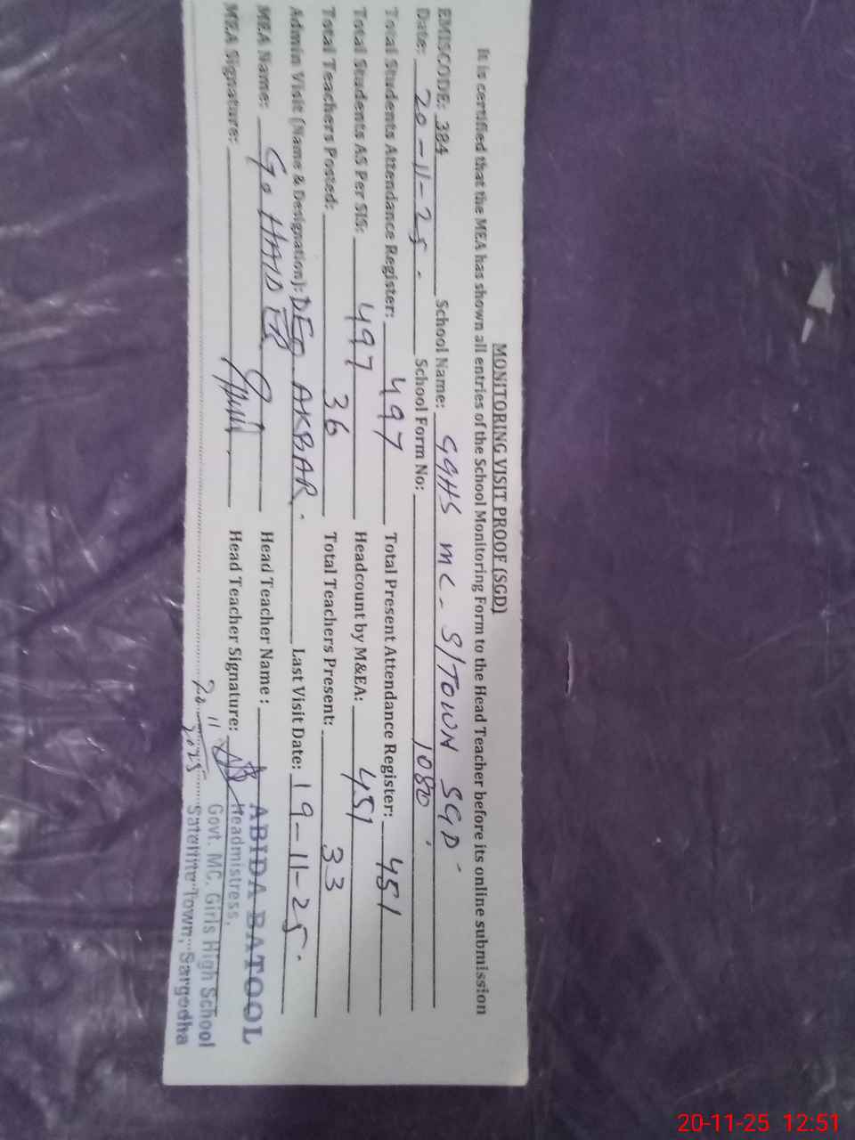| EMIS Code: 38420079 | Name of School: GGHS MC SATTELITE TOWN SARGODHA | |||