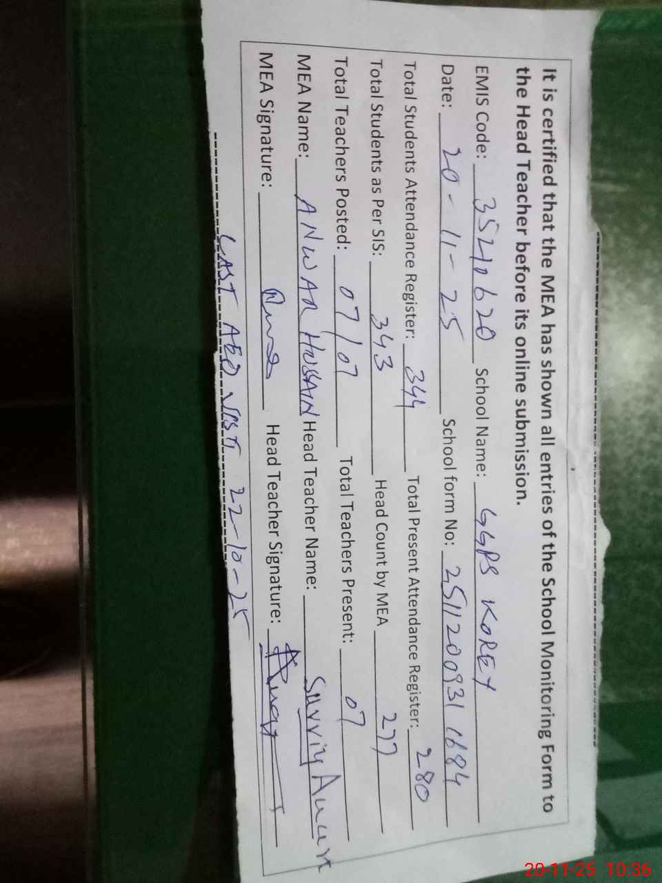 | Remarks (Use Separate Page if Required): School facing problem shortage of Class Room Total 344 student only 04 small class Rooms 4 class sitting in corridor 1 class and 2 class total 67 student sitting in one room KG 132 student sitting in one room AEO last visit on 22nd October 2025 35210620 | |||||