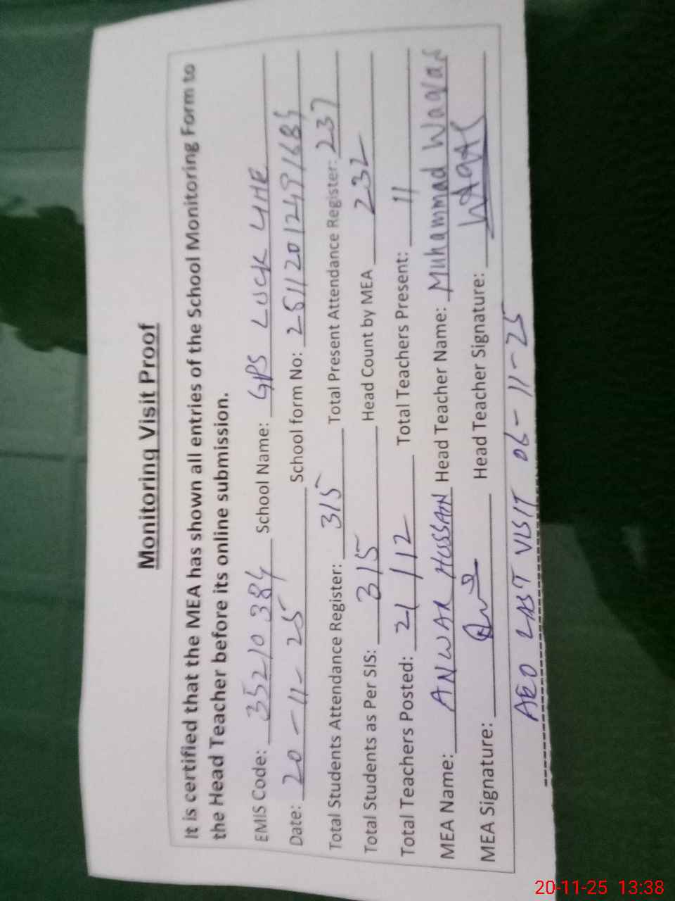 | EMIS Code: 35210384 | Name of School: GPS LUCK LINE LHR | |||
