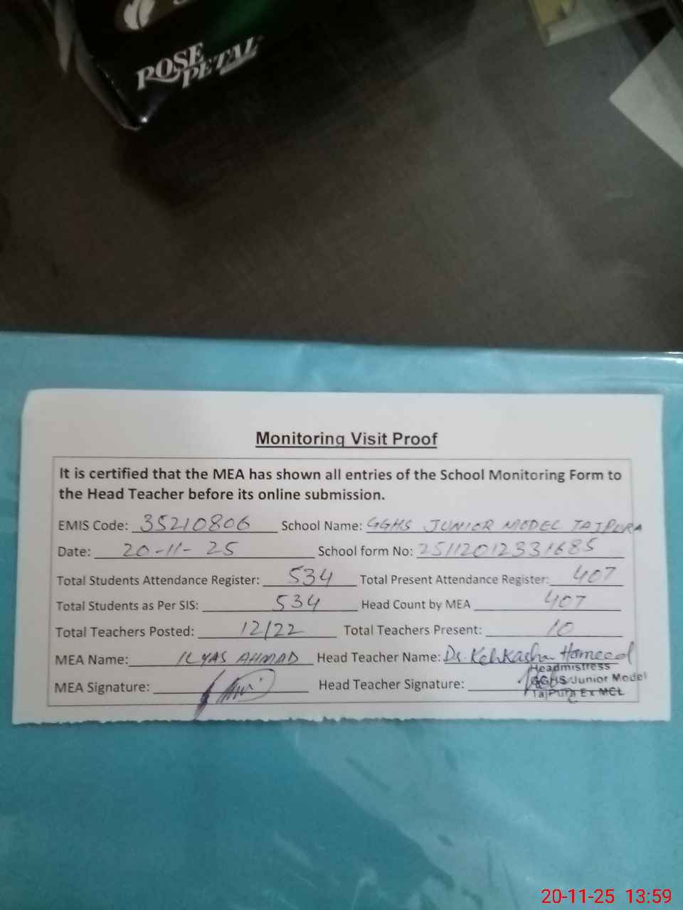 | Attendance Register | Head Teacher | MEA with School | Visit Proof |