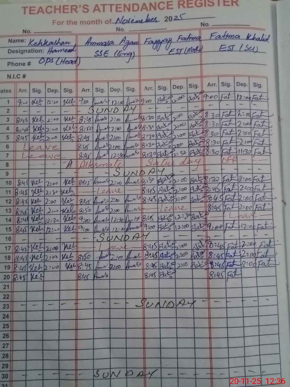 | CNIC | Full Name | Designation | R/C | Absence During Last Calender Month |