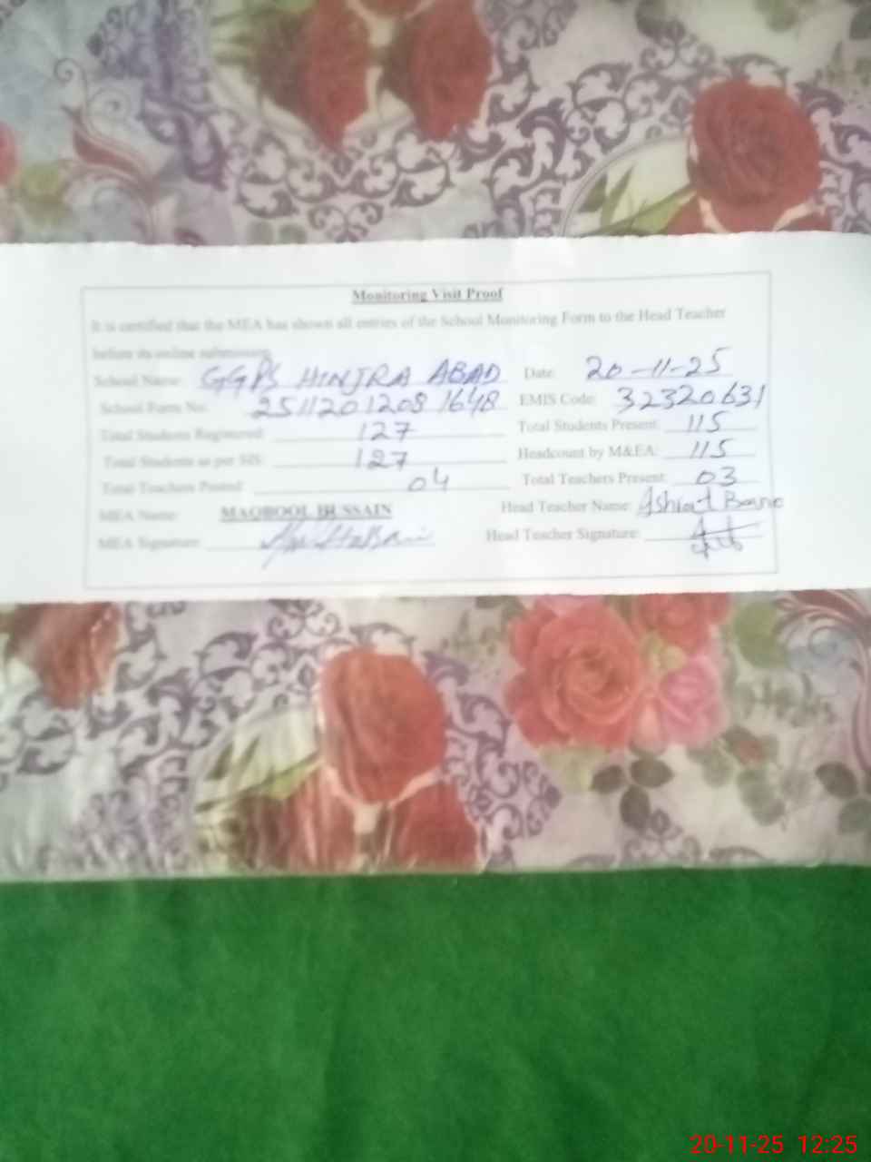 | Attendance Register | Head Teacher | MEA with School | Visit Proof |