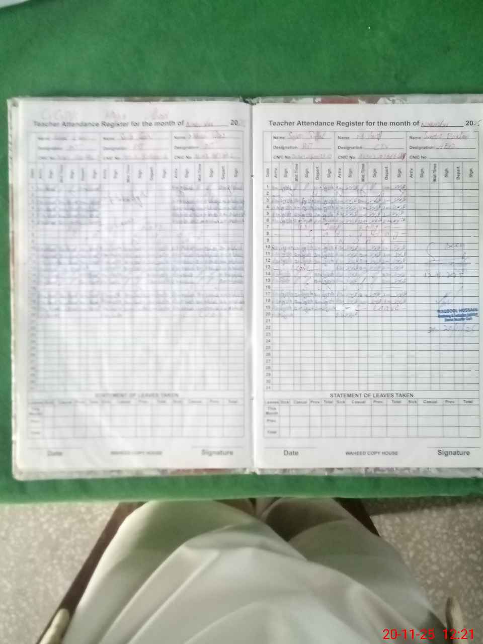 | CNIC | Full Name | Designation | R/C | Absence During Last Calender Month |