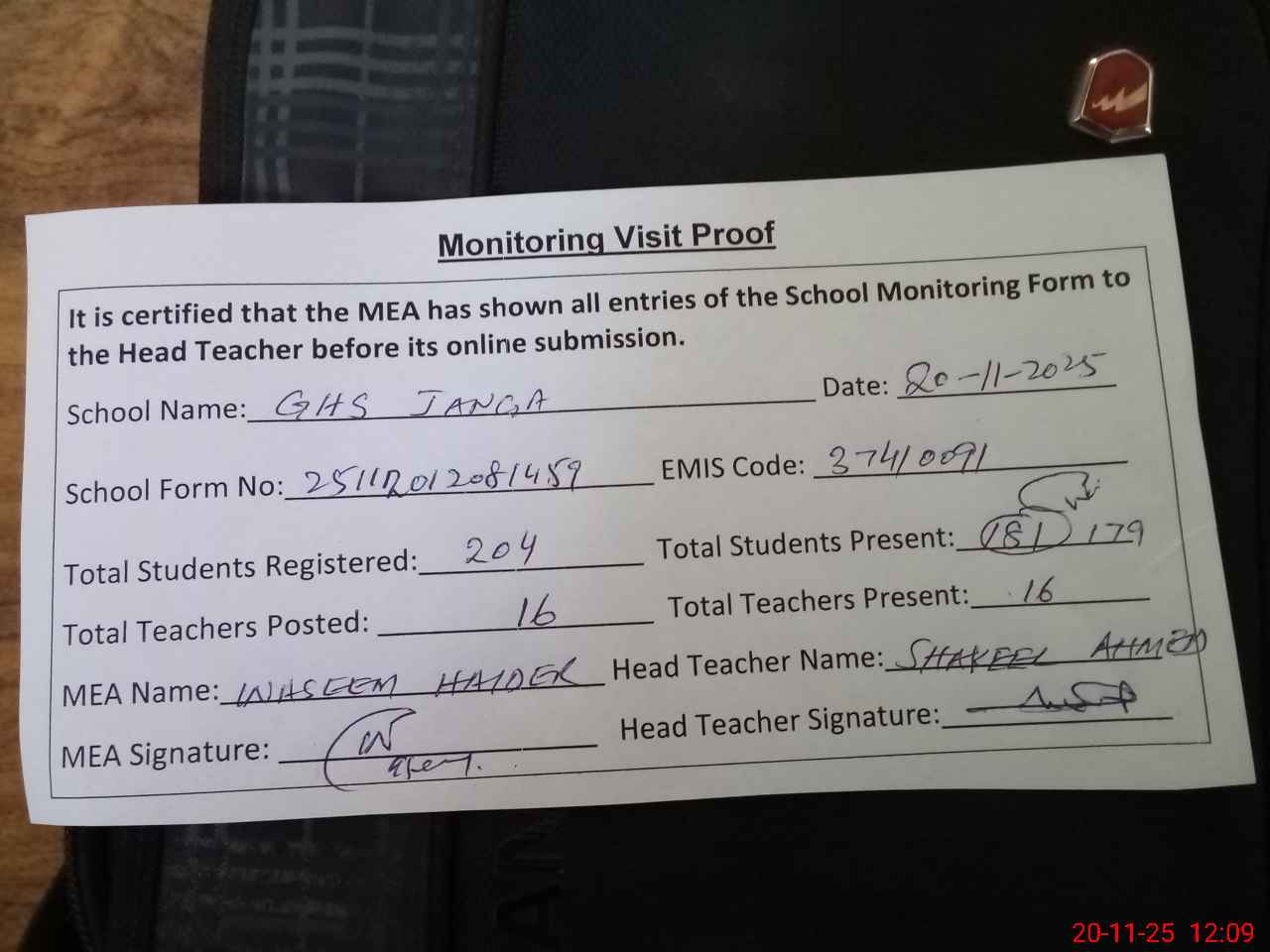 | Attendance Register | Head Teacher | MEA with School | Visit Proof |