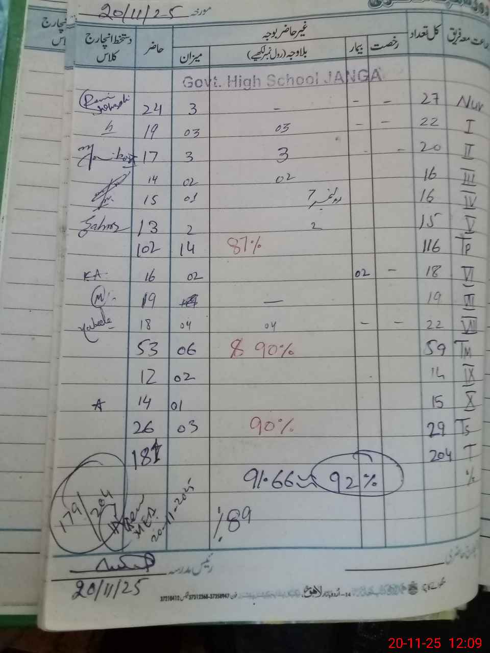 | No. of Students Present - Male | 5 | 0 | 19 | 19 | 16 | 14 | 15 | 13 | 16 | 19 | 17 | 12 | 14 | 179 | ||