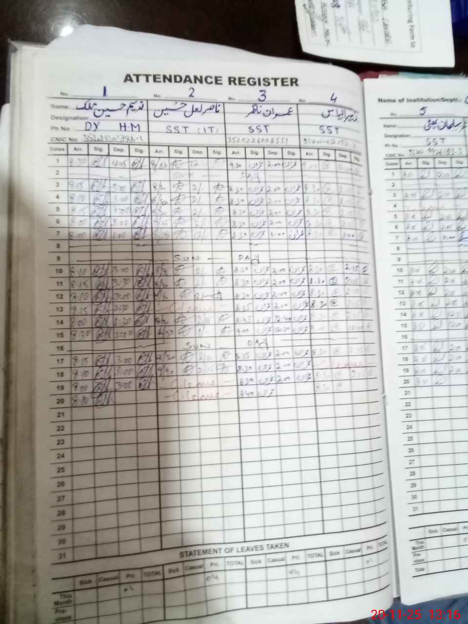 | CNIC | Full Name | Designation | R/C | Absence During Last Calender Month |