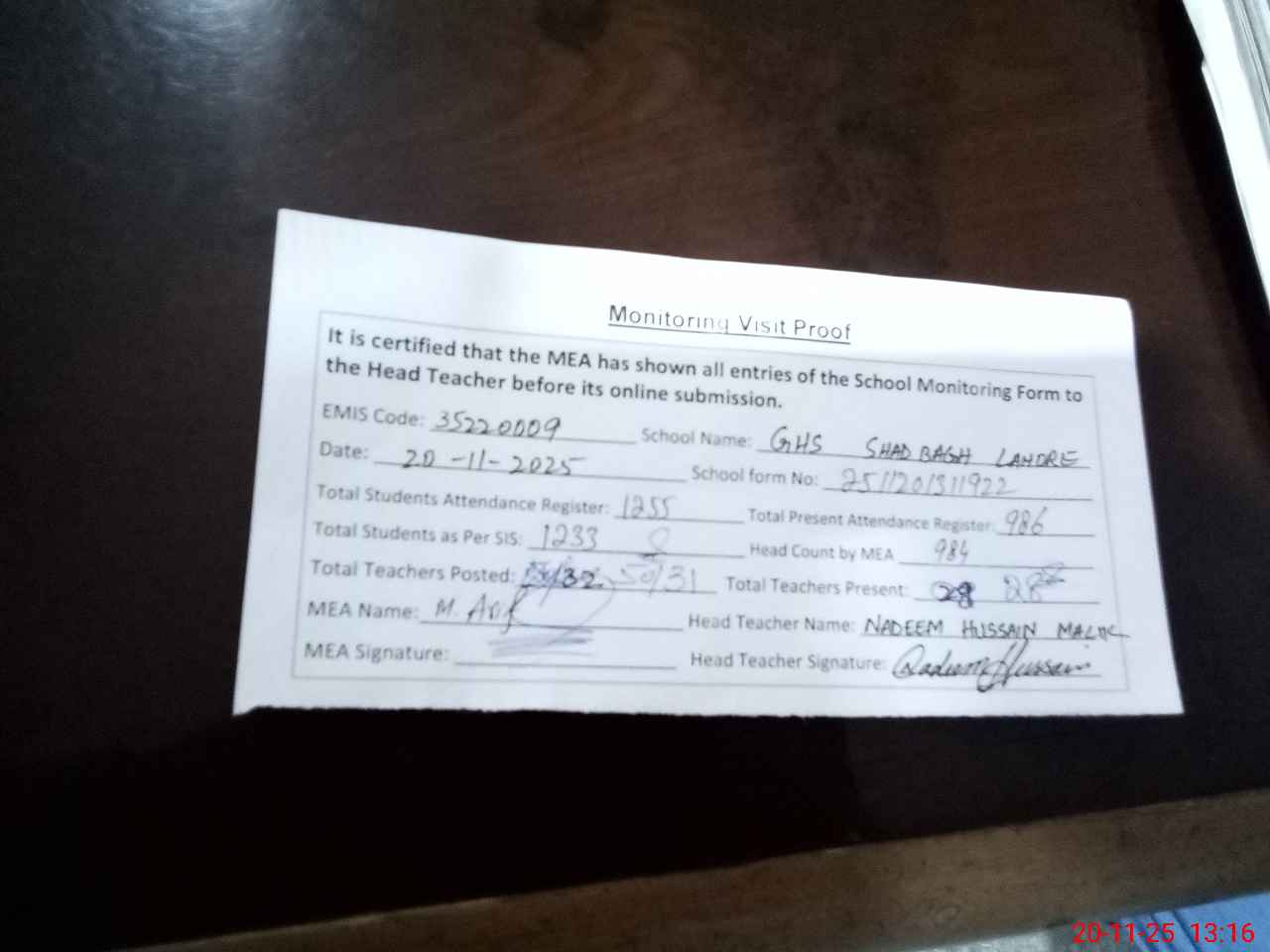 | Attendance Register | Head Teacher | MEA with School | Visit Proof |