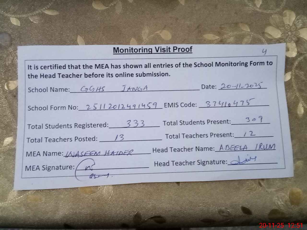 | Attendance Register | Head Teacher | MEA with School | Visit Proof |