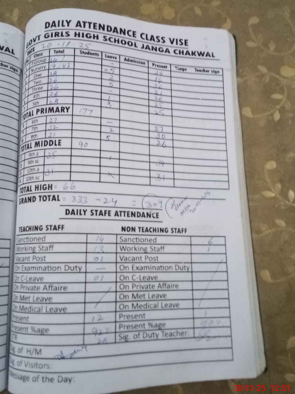 | No. of Students Present - Female | 24 | 0 | 14 | 26 | 21 | 26 | 25 | 25 | 27 | 30 | 26 | 34 | 31 | 309 | ||