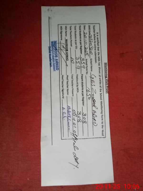| Attendance Register | Head Teacher | MEA with School | Visit Proof |
