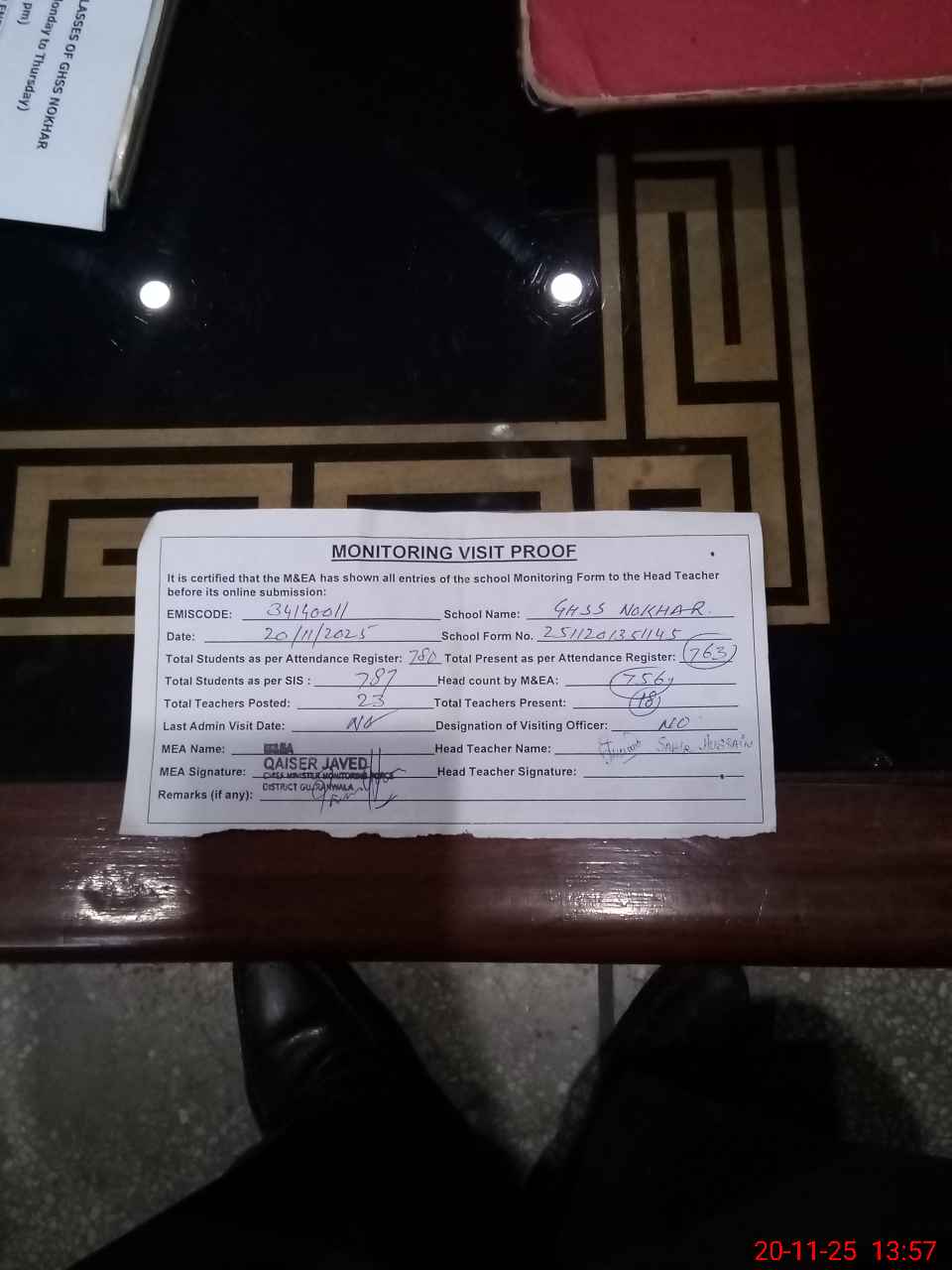 | Attendance Register | Head Teacher | MEA with School | Visit Proof |