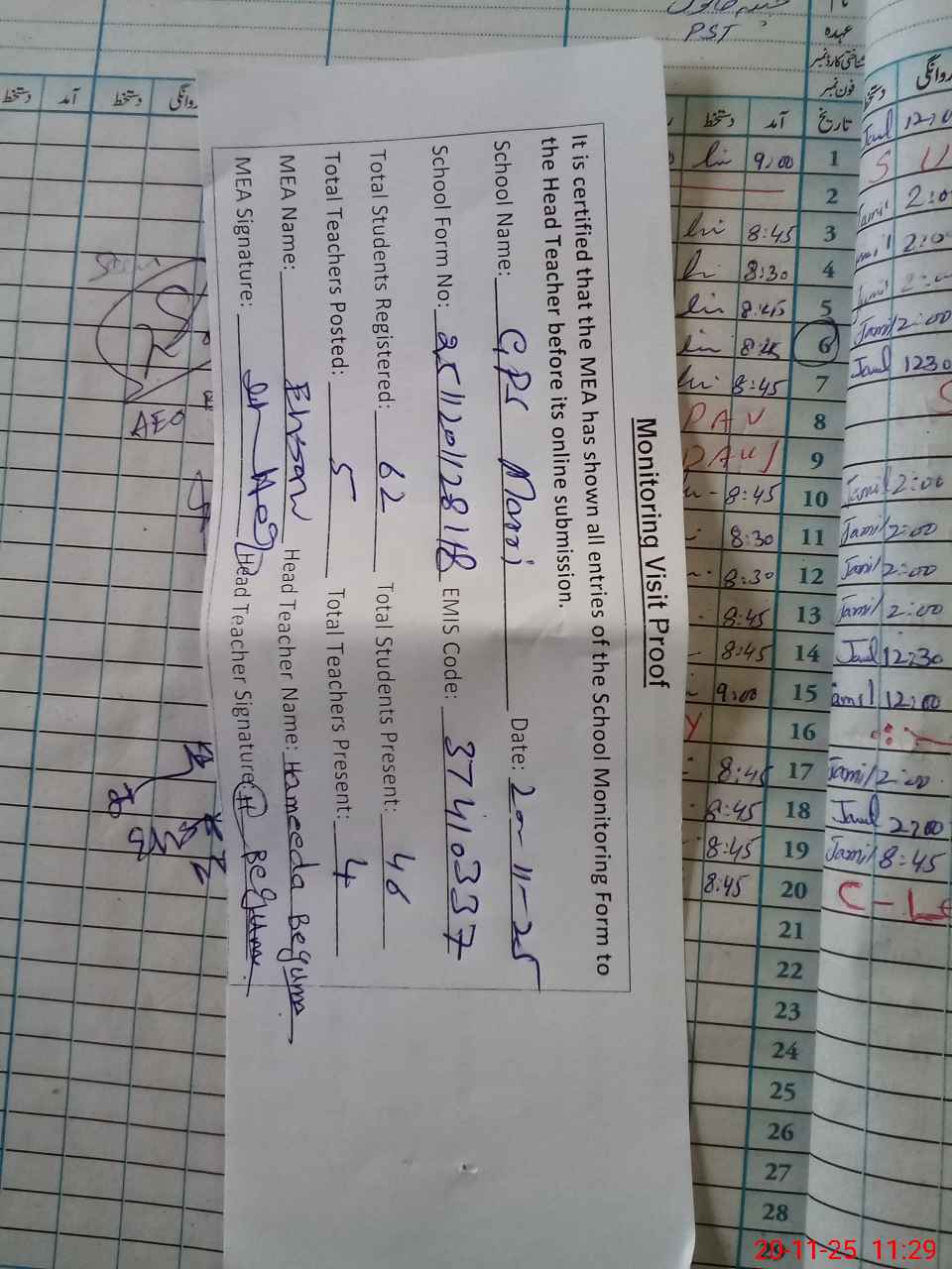 | Attendance Register | Head Teacher | MEA with School | Visit Proof |