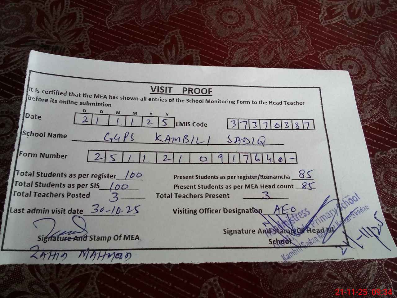 | Attendance Register | Head Teacher | MEA with School | Visit Proof |