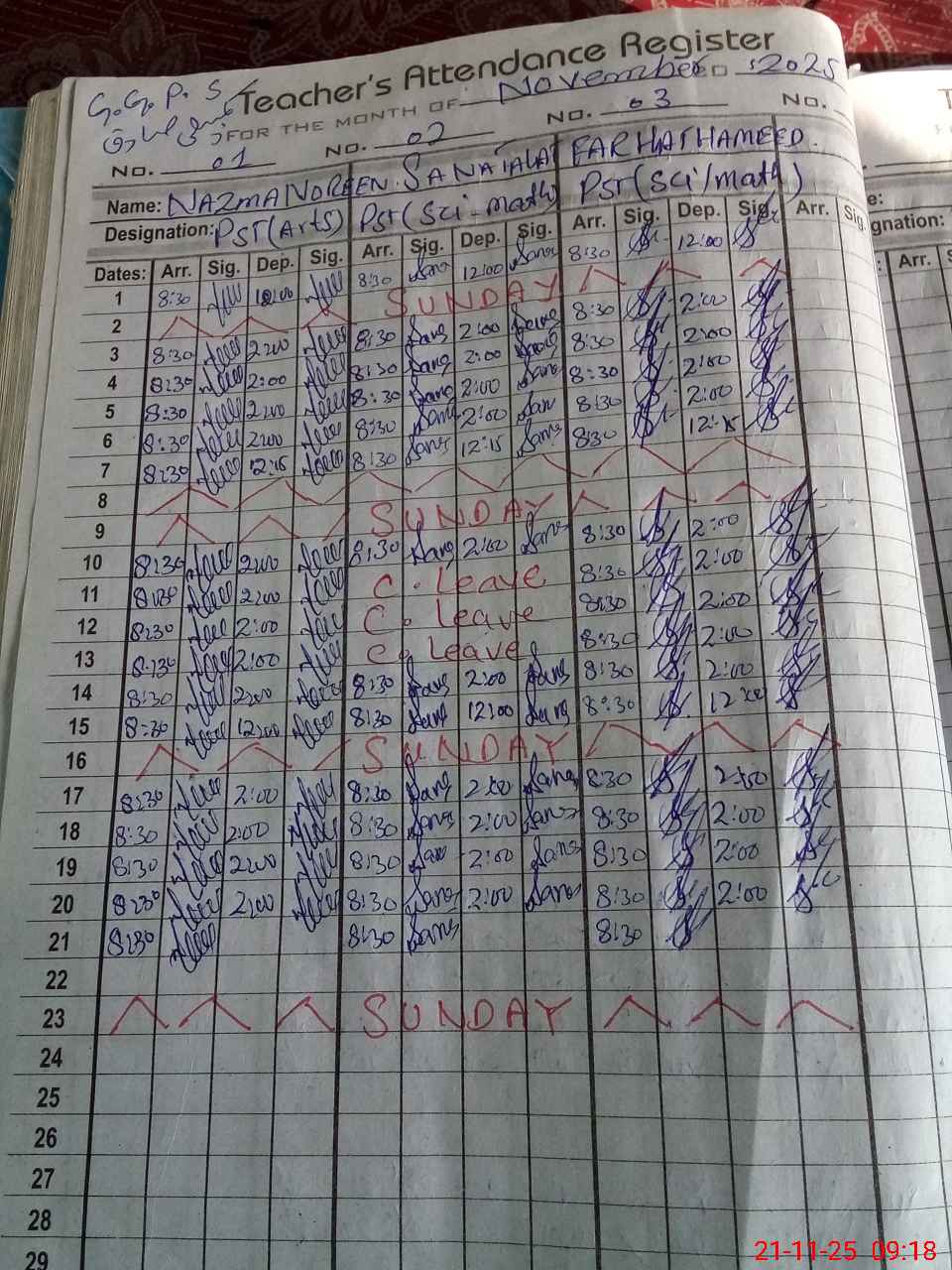 | CNIC | Full Name | Designation | R/C | Absence During Last Calender Month |