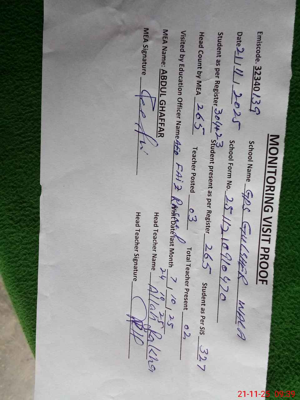 | Attendance Register | Head Teacher | MEA with School | Visit Proof |
