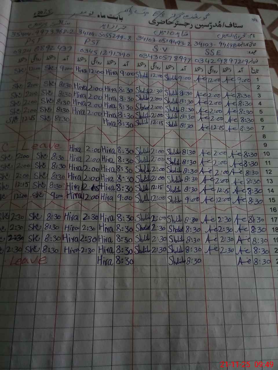 | CNIC | Full Name | Designation | R/C | Absence During Last Calender Month |