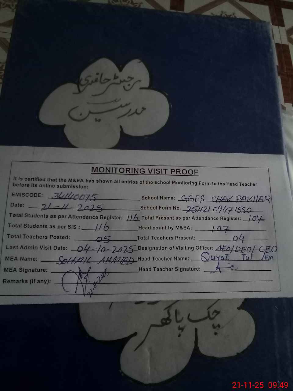 | Attendance Register | Head Teacher | MEA with School | Visit Proof |