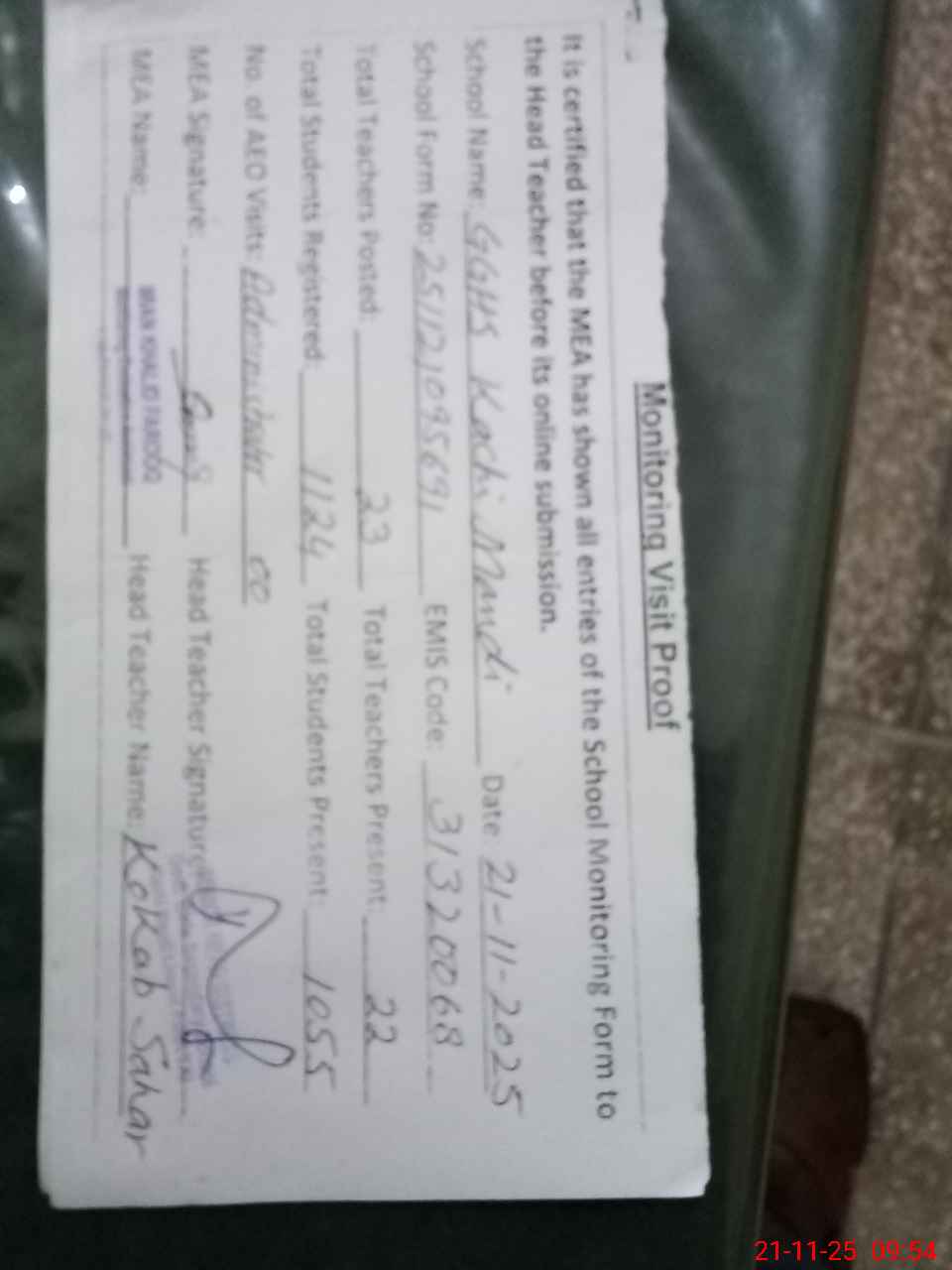 | Attendance Register | Head Teacher | MEA with School | Visit Proof |