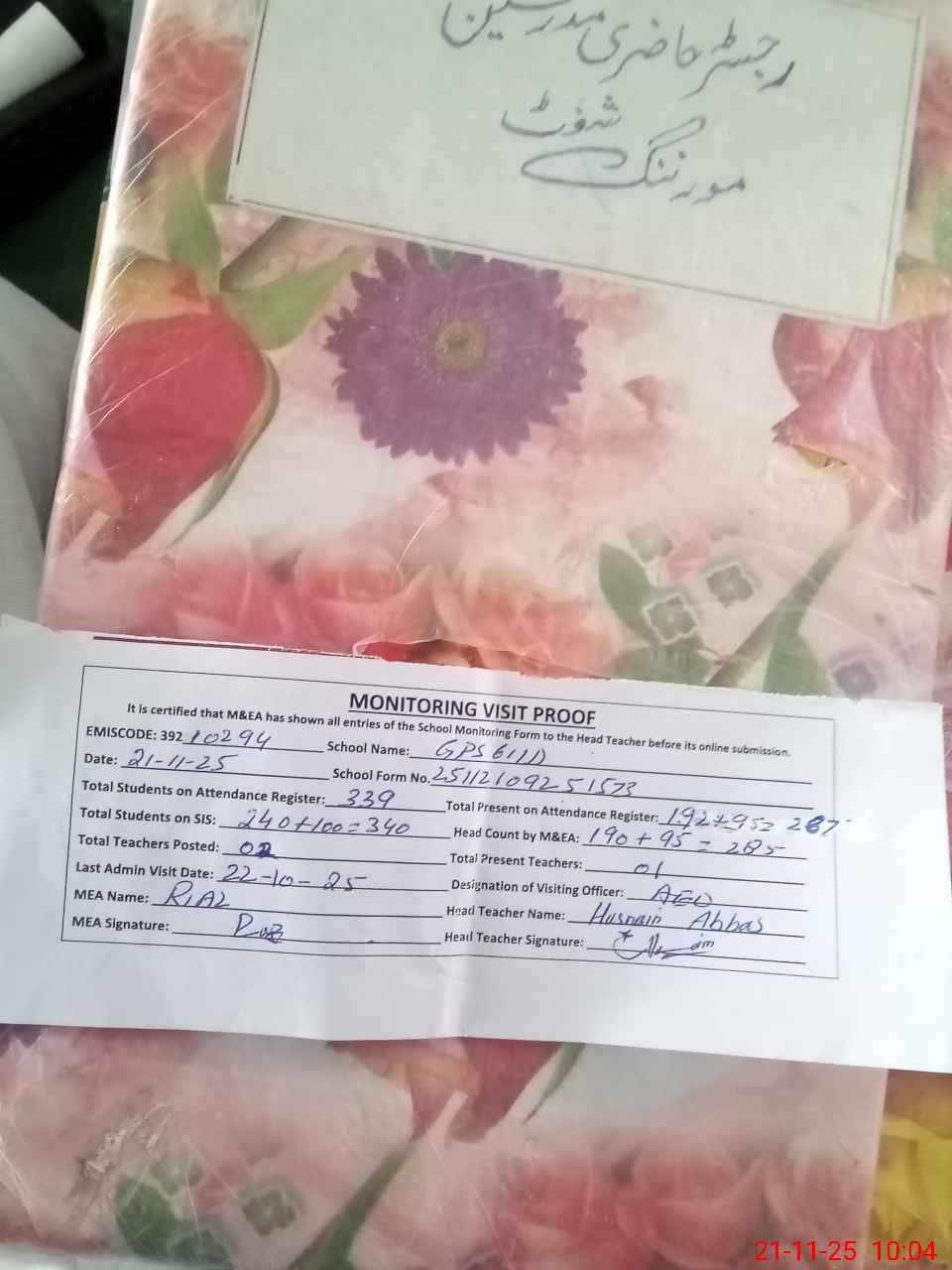 | Attendance Register | Head Teacher | MEA with School | Visit Proof |