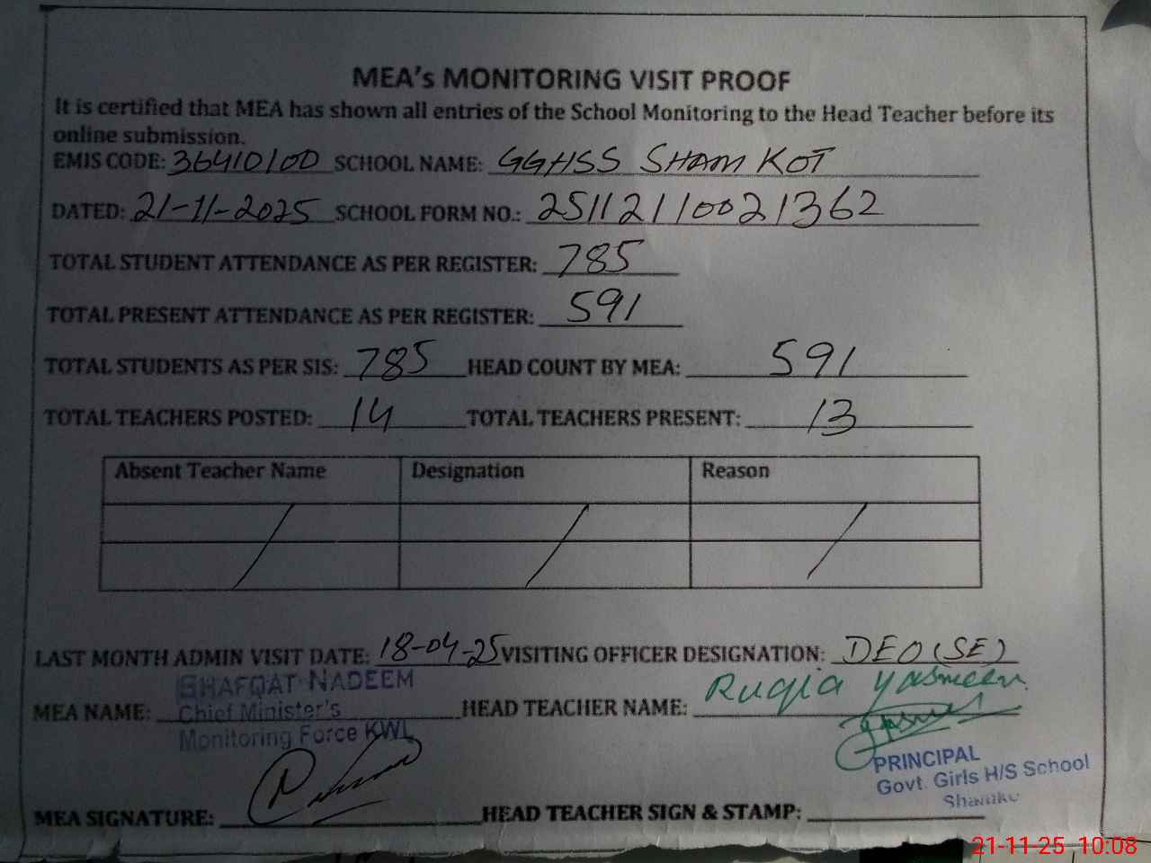 | Attendance Register | Head Teacher | MEA with School | Visit Proof |