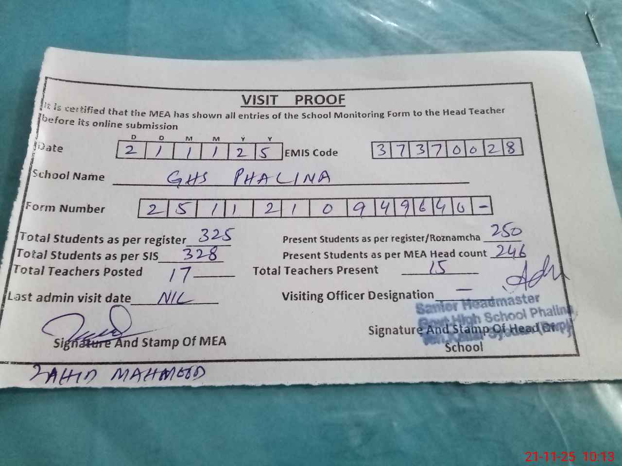 | Attendance Register | Head Teacher | MEA with School | Visit Proof |