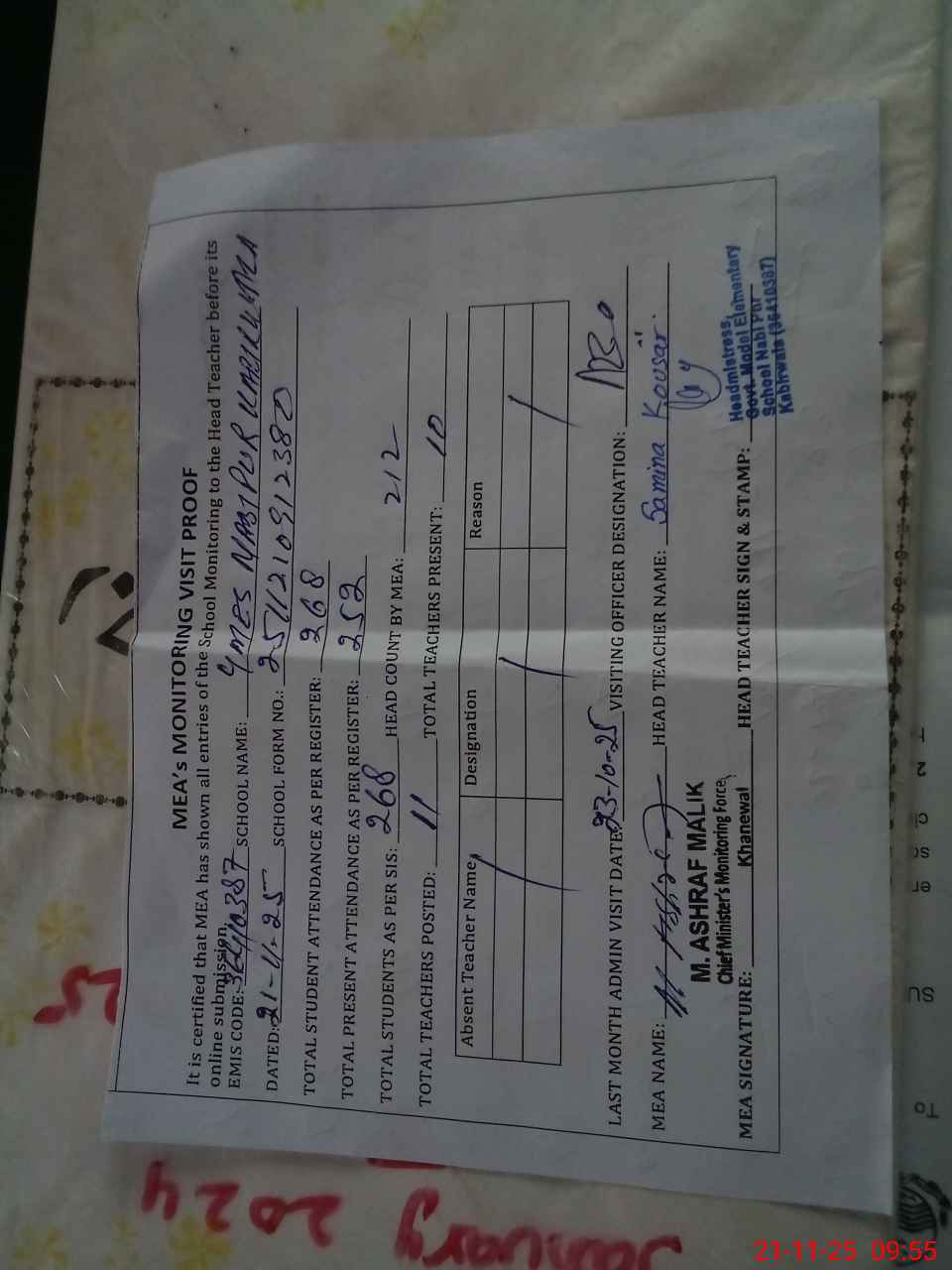 | Attendance Register | Head Teacher | MEA with School | Visit Proof |