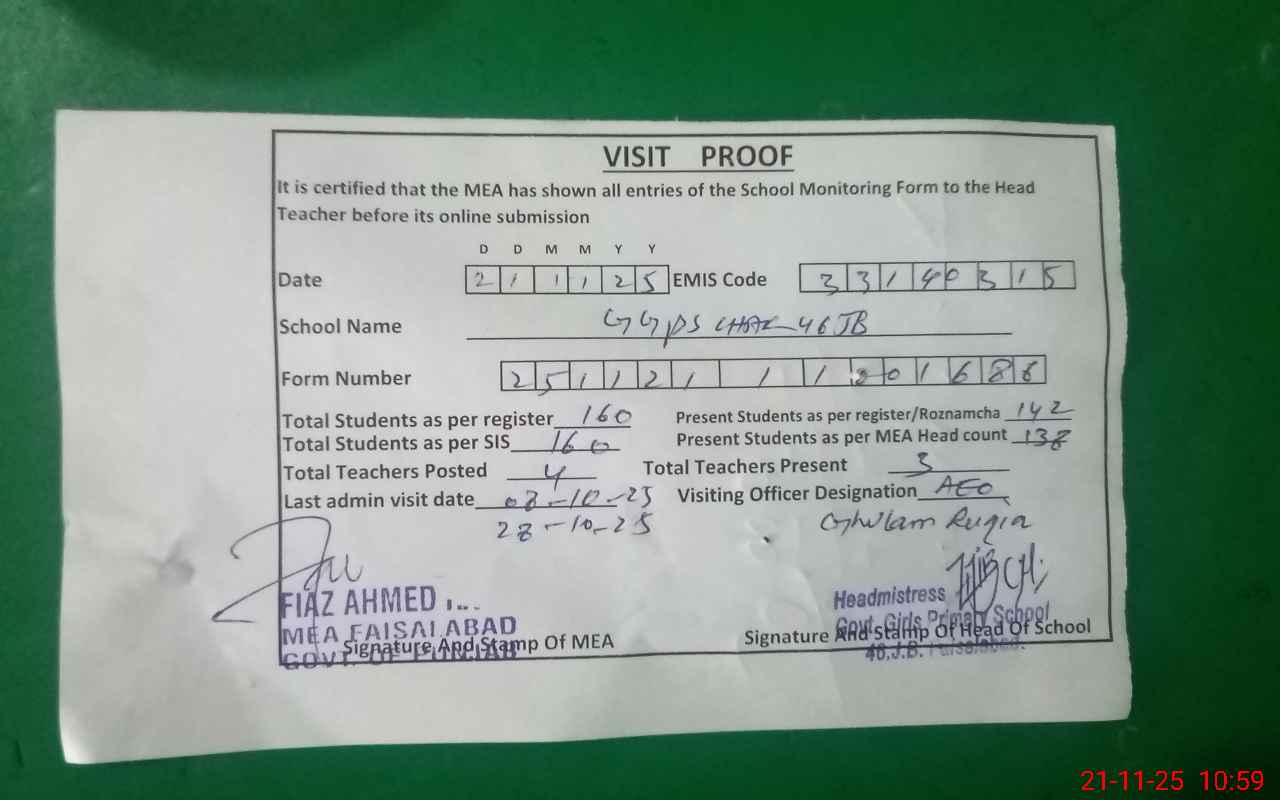 | Attendance Register | Head Teacher | MEA with School | Visit Proof |