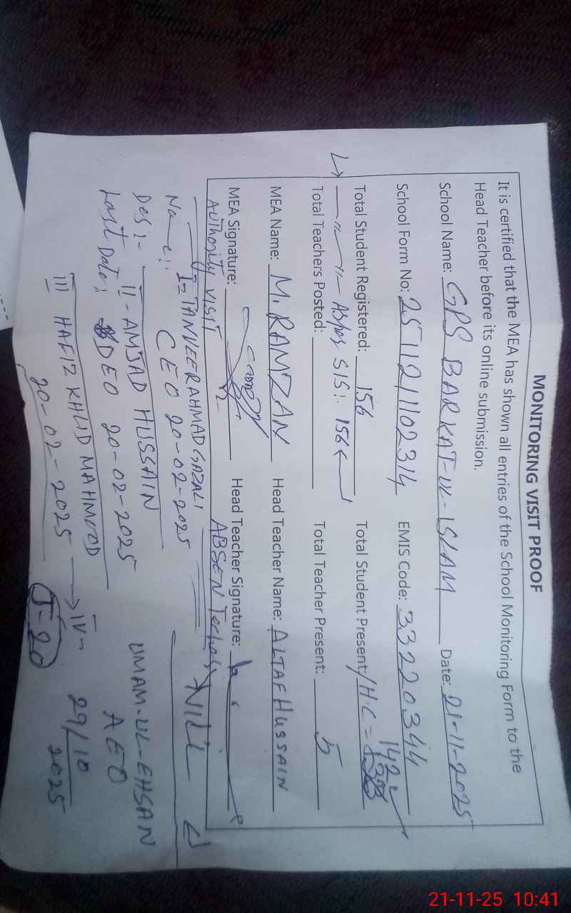 | EMIS Code: 33220344 | Name of School: GPS BARKAT UL ISLAM | |||