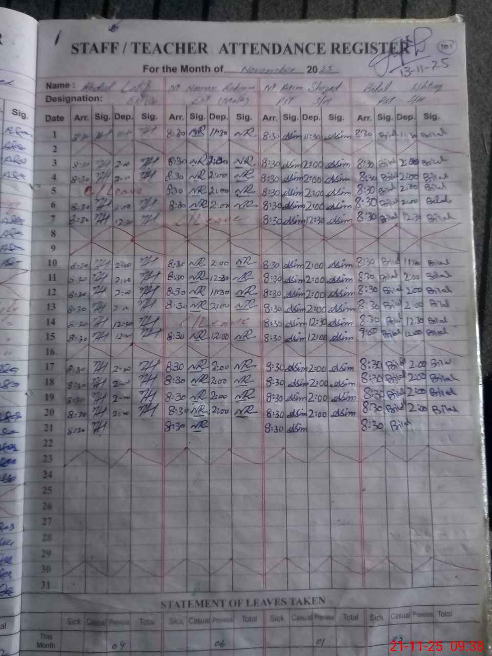 | CNIC | Full Name | Designation | R/C | Absence During Last Calender Month |