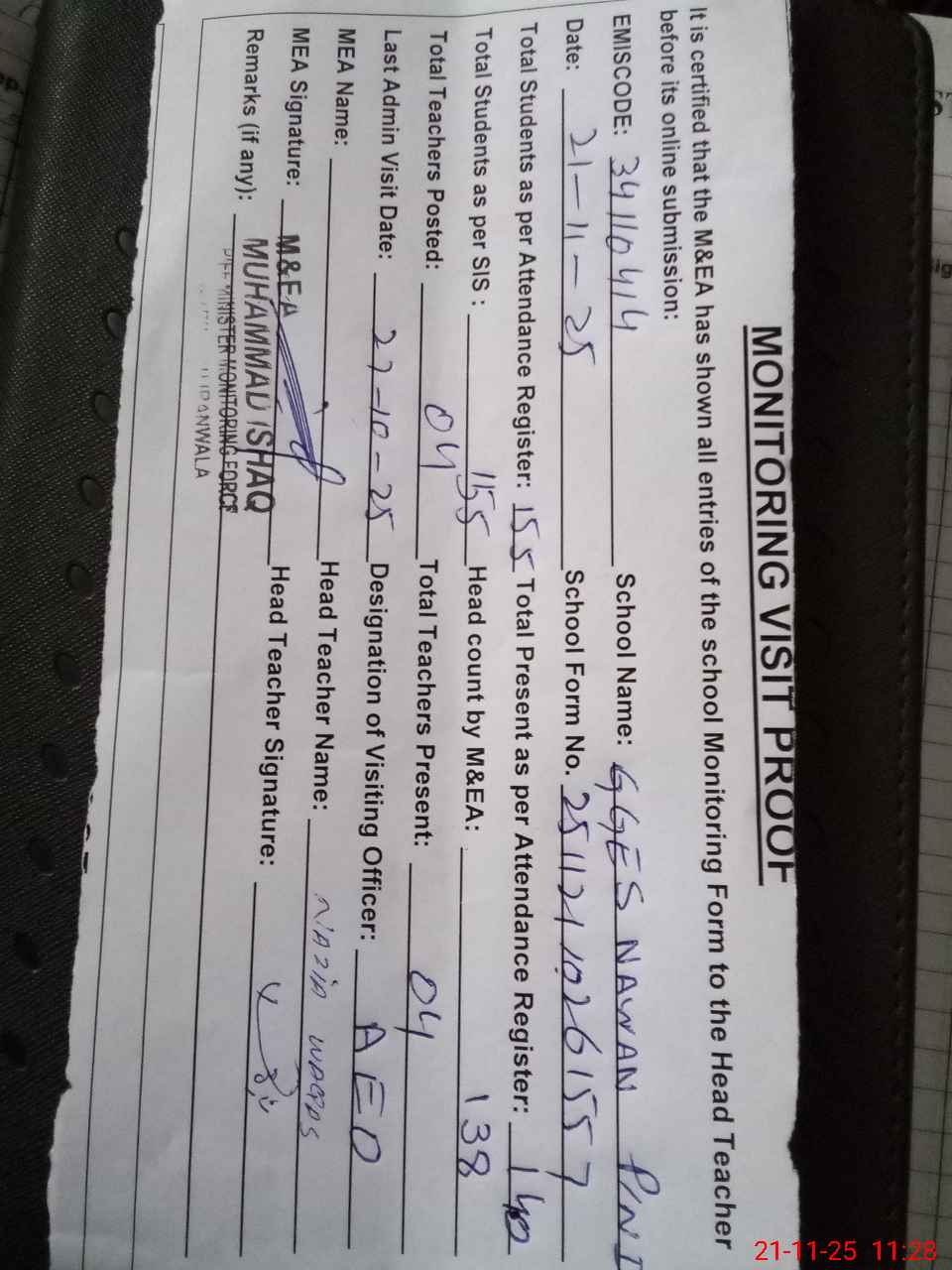 | Attendance Register | Head Teacher | MEA with School | Visit Proof |