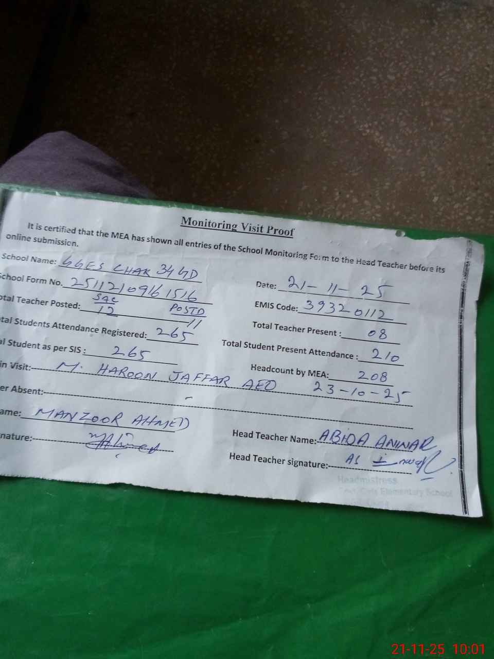 | Attendance Register | Head Teacher | MEA with School | Visit Proof |
