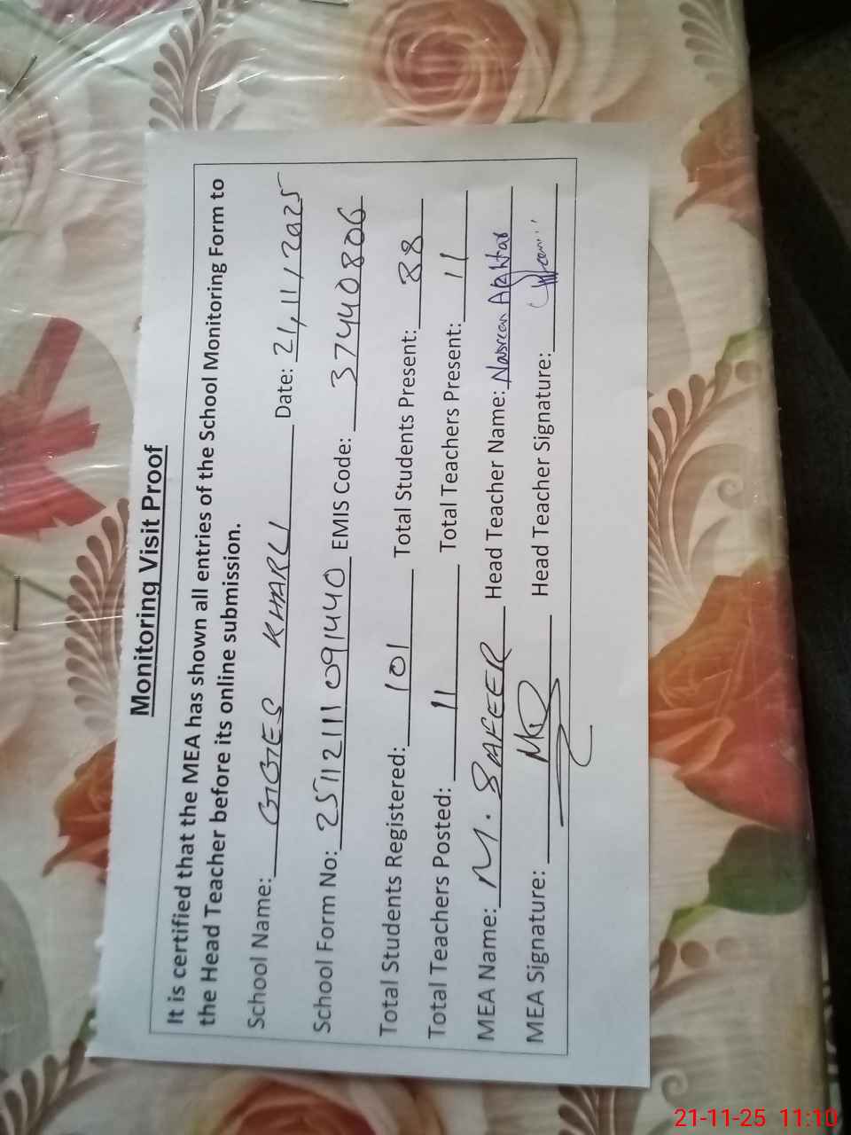 | Attendance Register | Head Teacher | MEA with School | Visit Proof |