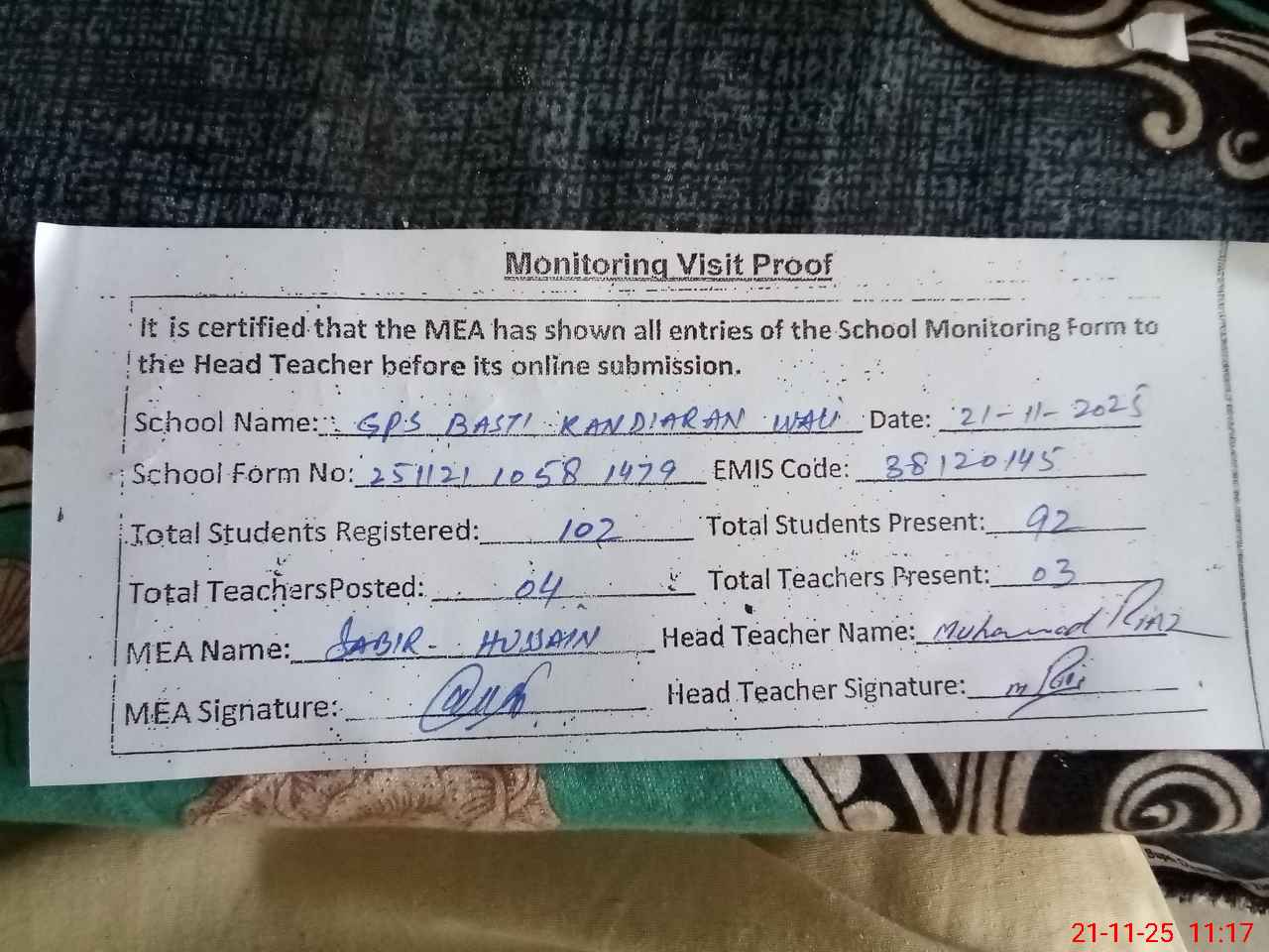 | Remarks (Use Separate Page if Required): last visit by AEO TAHIR IQBAL ON 18 10 2025 | |||||