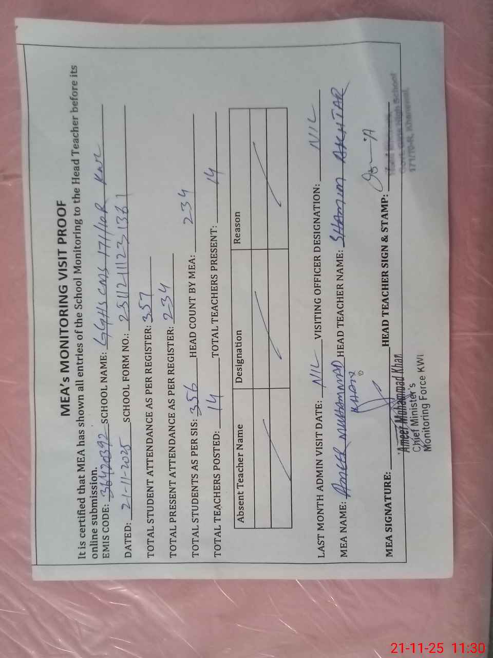 | Attendance Register | Head Teacher | MEA with School | Visit Proof |