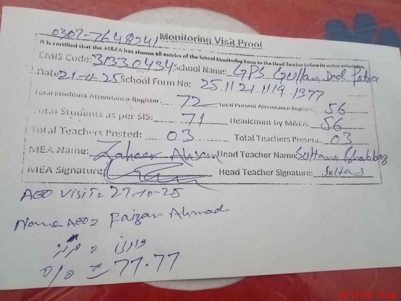 | Monitoring Date: 21-11-2025 | Start Time: 21-11-2025 10:34 AM | End Time: 21-11-2025 11:36 AM | Name of MEA: Za**** Ah**** | |