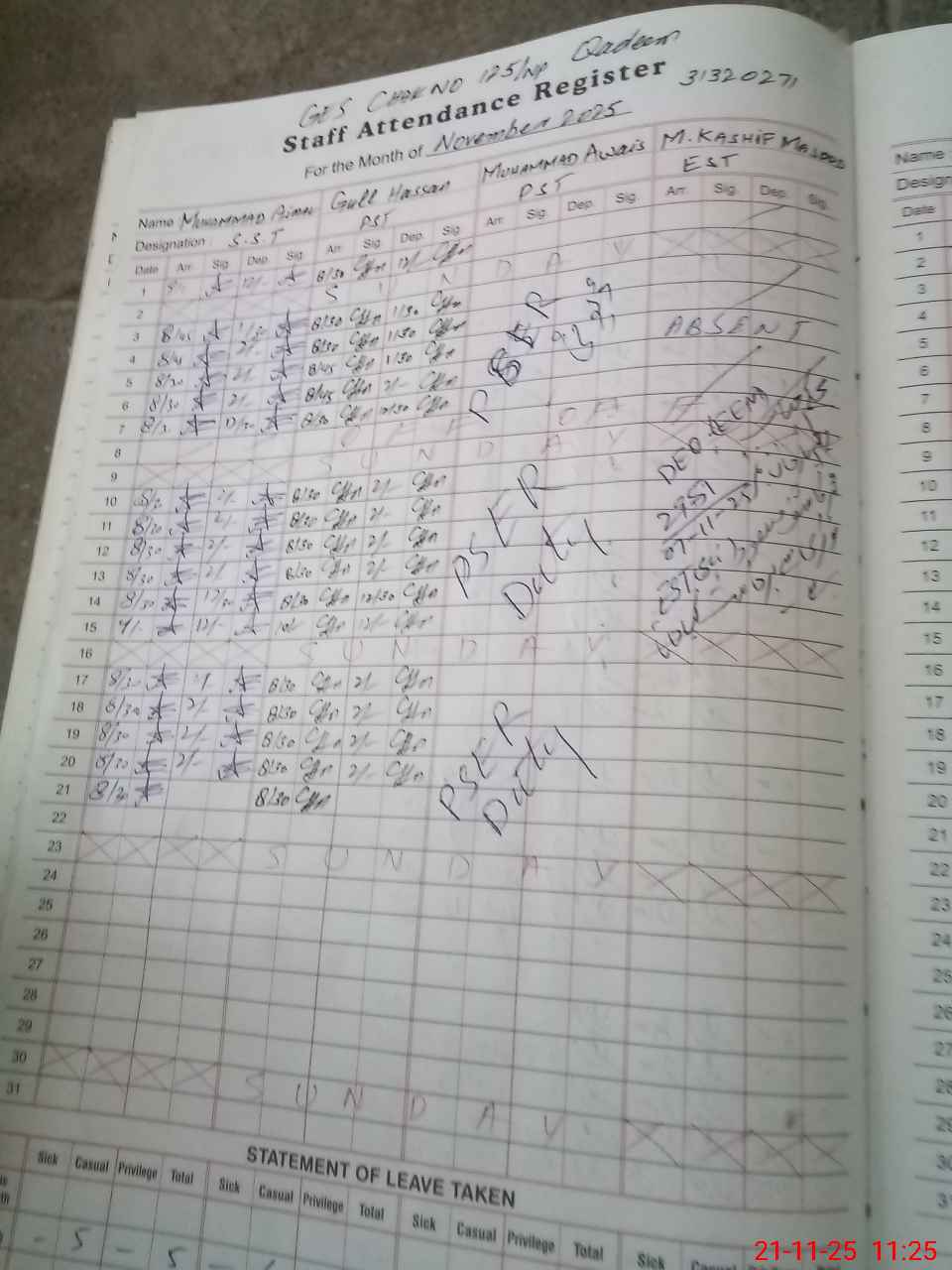 | CNIC | Full Name | Designation | R/C | Absence during last cal. month |