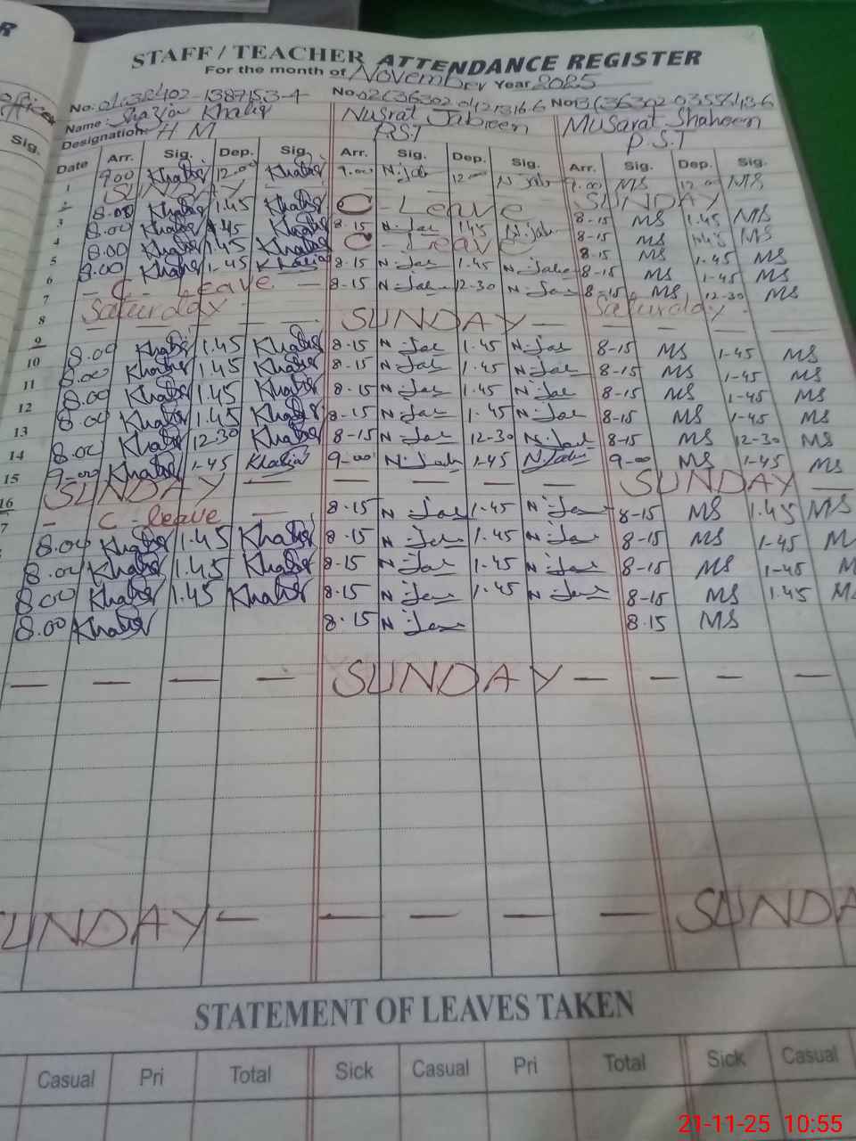 | CNIC | Full Name | Designation | R/C | Absence During Last Calender Month |