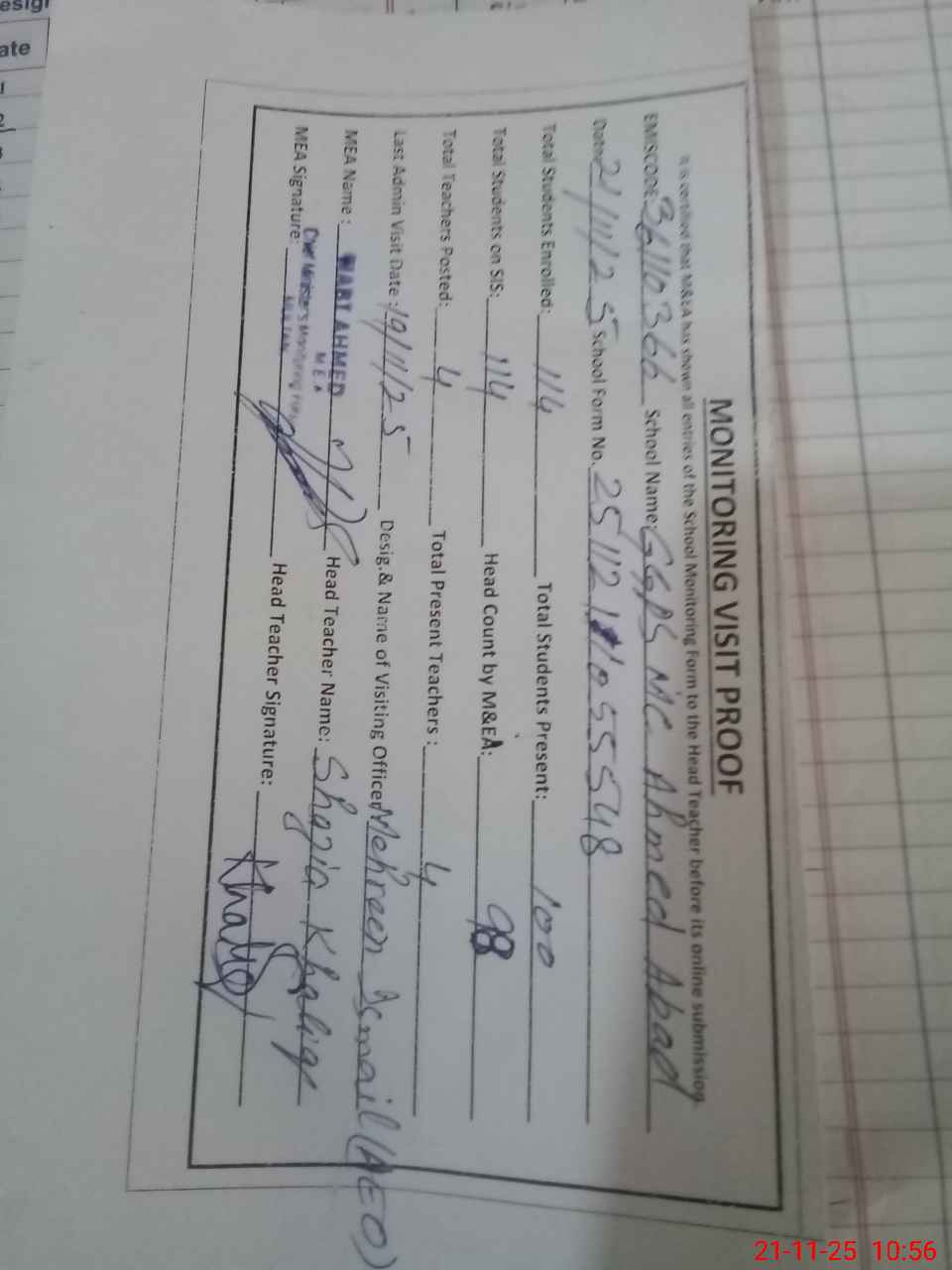 | Attendance Register | Head Teacher | MEA with School | Visit Proof |