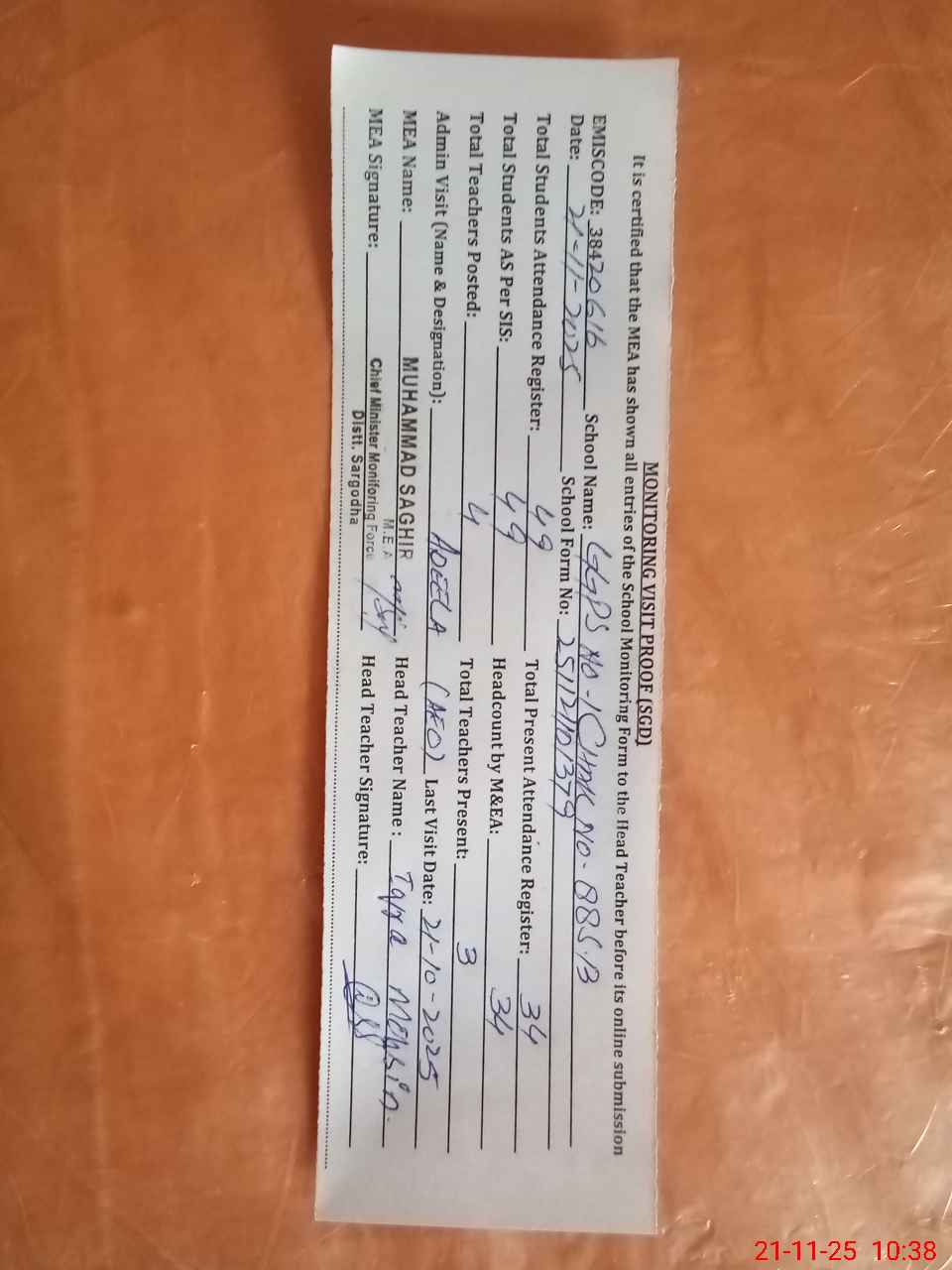 | Attendance Register | Head Teacher | MEA with School | Visit Proof |