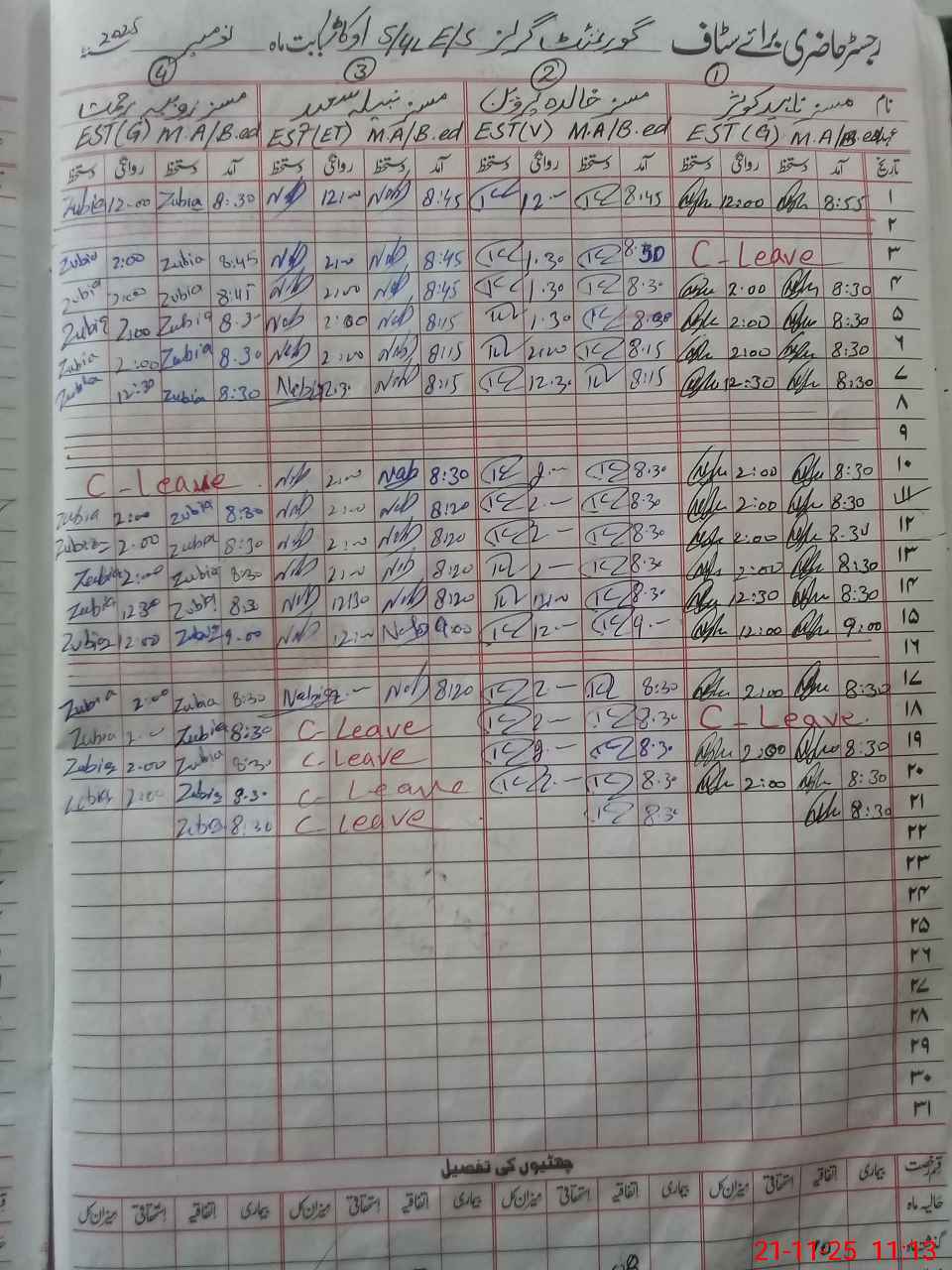 | CNIC | Full Name | Designation | R/C | Absence During Last Calender Month |