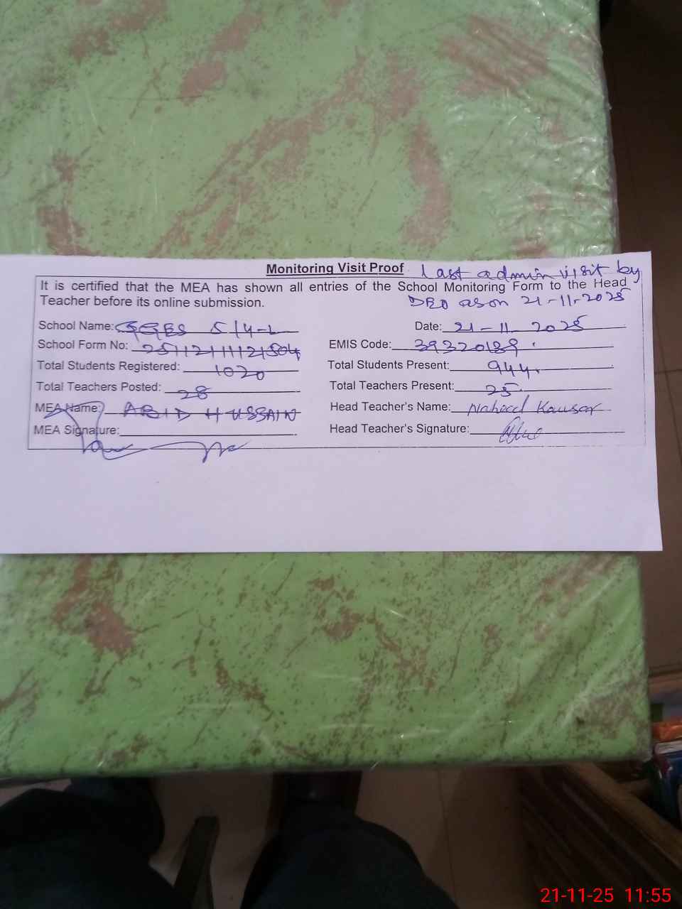 | Remarks (Use Separate Page if Required): Last Administrator visit by DEO as on 21 November 2025 | |||||