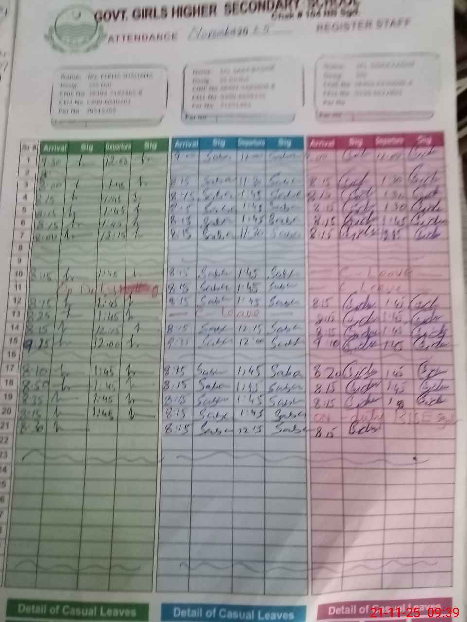 | CNIC | Full Name | Designation | R/C | Absence during last cal. month |