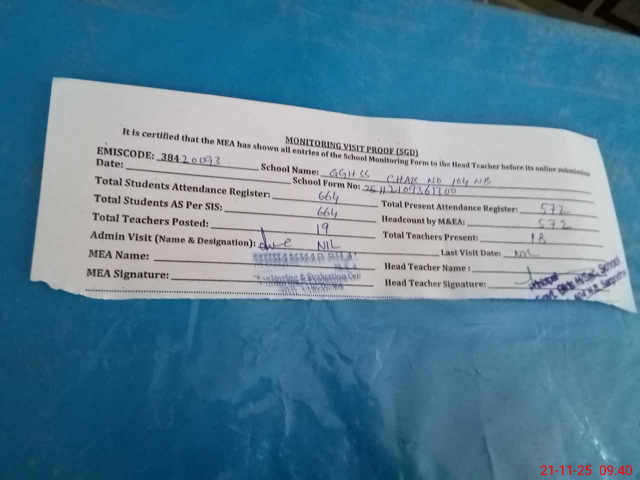 | Attendance Register | Head Teacher | MEA with School | Visit Proof |
