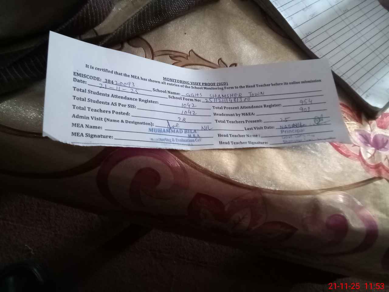 | Attendance Register | Head Teacher | MEA with School | Visit Proof |