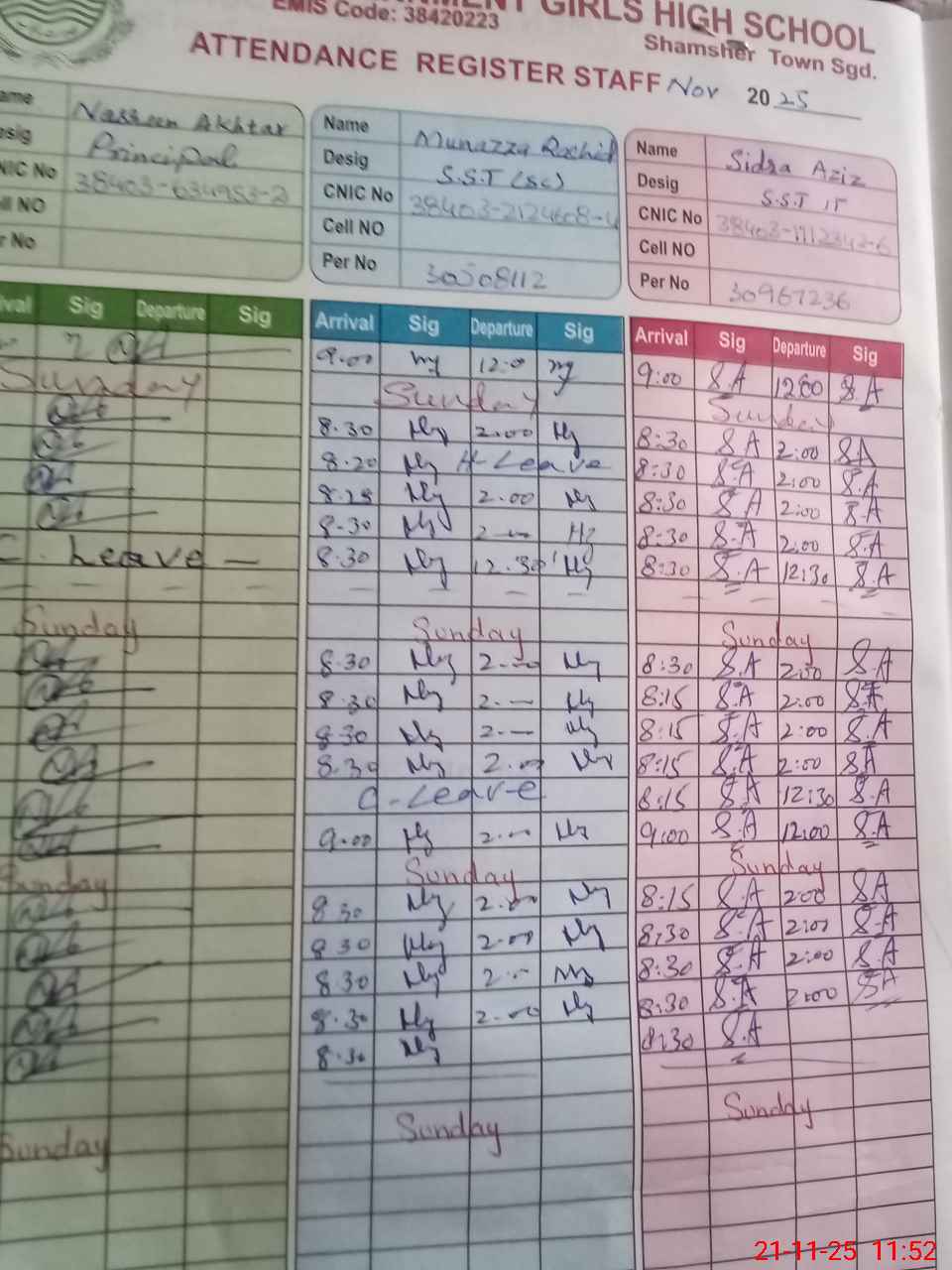 | CNIC | Full Name | Designation | R/C | Absence during last cal. month |