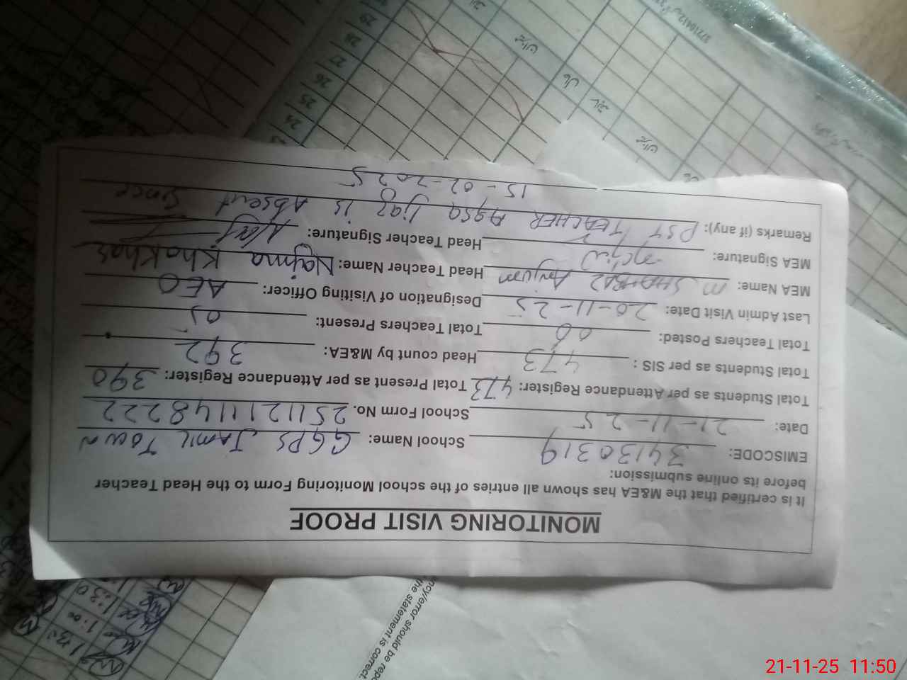 | Attendance Register | Head Teacher | MEA with School | Visit Proof |
