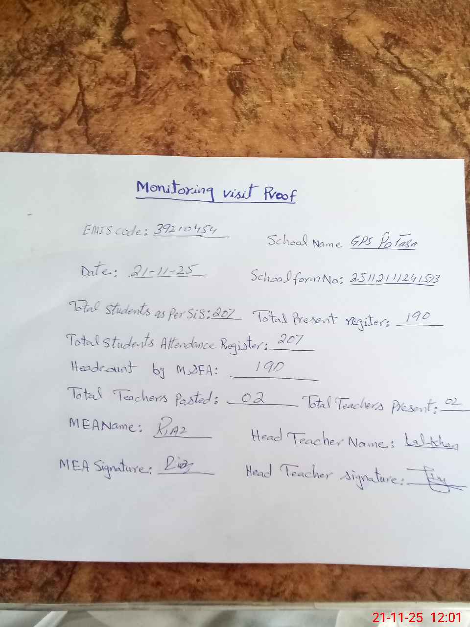 | Attendance Register | Head Teacher | MEA with School | Visit Proof |