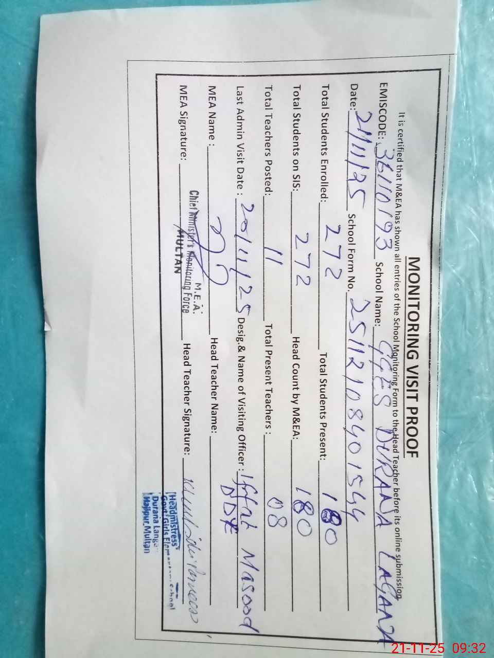 | Attendance Register | Head Teacher | MEA with School | Visit Proof |